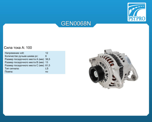 ХарактеристикиVolt: 12 A: 100 Размер посадочного места A (мм): 38,5 Размер посадочного места B (мм): 13 Размер посадочного места C (мм): 81,5 Количество ручьев шкива pc: 6 pcs Тип сигнала: L-S