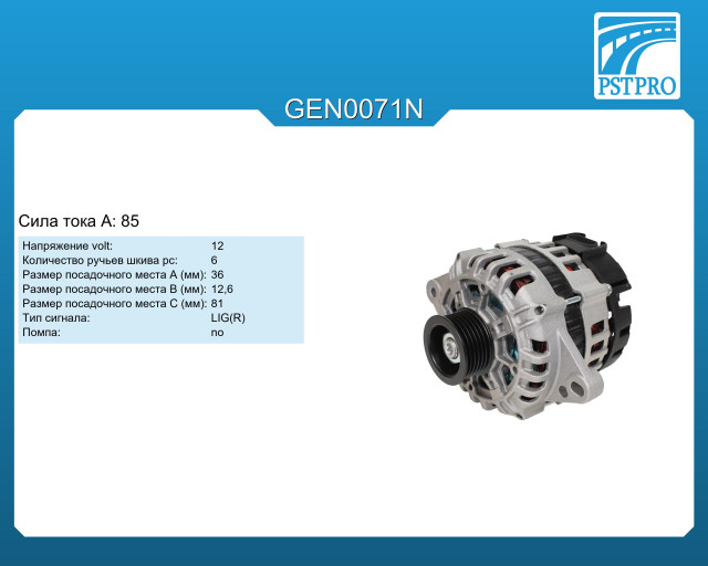 ХарактеристикиVolt: 12 A: 85 Размер посадочного места A (мм): 36 Размер посадочного места B (мм): 12,6 Размер посадочного места C (мм): 81 Количество ручьев шкива pc: 6 pcs Тип сигнала: L-IG(R)